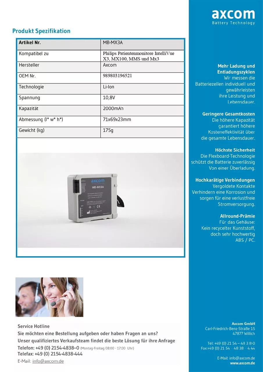 Da wir von Axcom Battery Technology unsere Akkumulatoren eigenständig entwickeln und anschließend produzieren, ist es uns möglich, volle Kontrolle über die Qualität unserer Produkte zu bewahren. Dabei ist es uns wichtig, Ihnen trotz unserer aufwendigen und sorgsamen Vorgehensweise einen günstigen und fairen Preis anzubieten. Kaufen Sie den Axcom-Akku MB-MX3A für den Philips IntelliVue X3, MX100, MMS und MX3 und profitieren Sie von unseren Vorteilen: