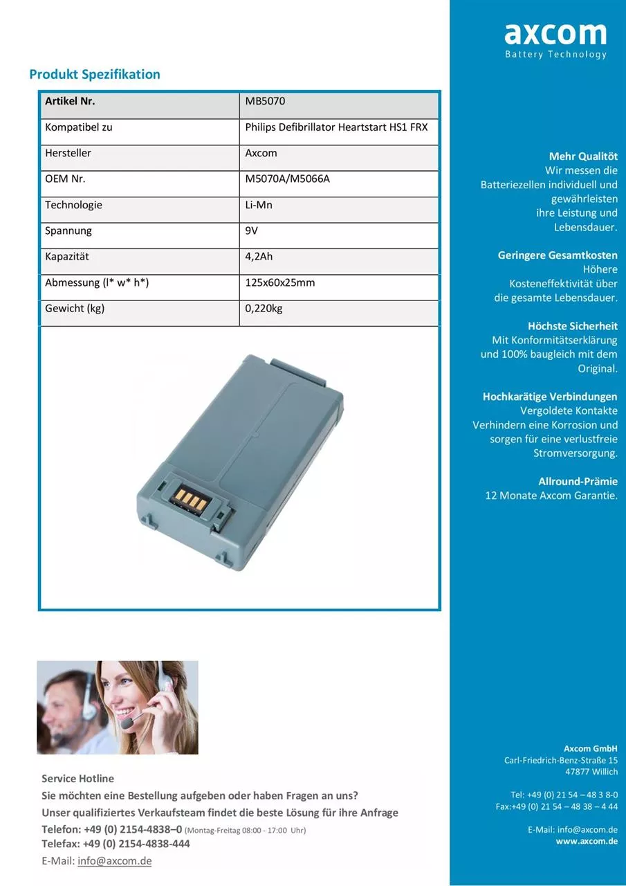 Unsere Li-Mn Batterien für Defibrillatoren bieten Ihnen höchste Qualität, eine lange Haltbarkeit und optimale Verarbeitung. Sie überzeugen durch ihr optimales Preis-Leistungs-Verhältnis gegenüber den Original-Batterien. Unsere geschulten Mitarbeiter beraten Sie gerne und stehen Ihnen selbstverständlich auch nach Kaufabschluss noch für technischen Support und Service zur Verfügung. Und nicht zuletzt können Sie die 12 monatige Axcom-Garantie in Anspruch nehmen, welche doppelt so lang wie bei vielen anderen Herstellern ist.