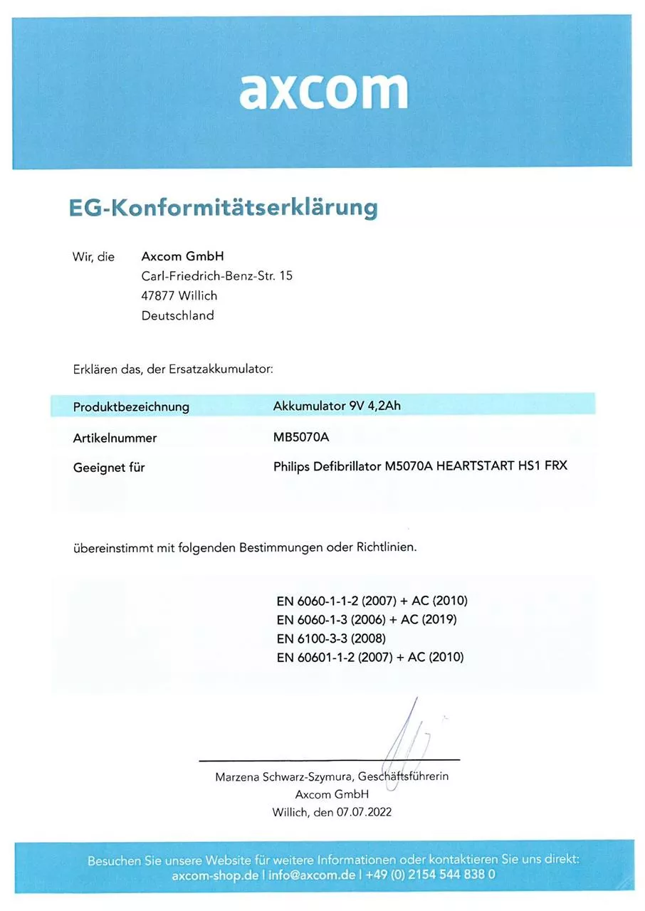 Die Batterie MB5070A ist mit den Philips AED Defibrillatoren HS1 und FRx kompatibel (OEM-Nr.: M5070A, M5066A). Sie ist einfach zu installieren und muss nicht geladen werden. Die Kompatibilität bestätigen wir mit einer Konformitätserklärung.